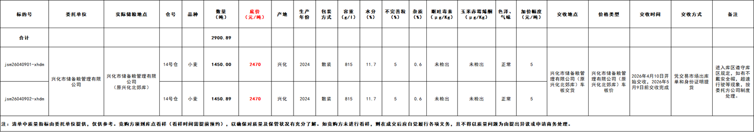質(zhì)量:以公告中賣方庫點實際質(zhì)量為準,公告中提供的質(zhì)量指標由委托單位提供,僅供參考。競購方須到庫點看樣(看樣時間需提前預約,聯(lián)系人:趙先生?******),以確保對質(zhì)量及保管狀況有充分了解。如競購方未進行看樣,則在成交后應(yīng)自覺履行各項義務(wù),且不得以質(zhì)量問題為由提出異議或申請商務(wù)處理。