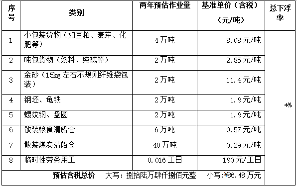(二)表中的作業(yè)量均為預(yù)估值,僅供供應(yīng)商參考,不作為結(jié)算依據(jù),最終結(jié)算以實(shí)際作業(yè)量為準(zhǔn)。供應(yīng)商應(yīng)對(duì)市場(chǎng)進(jìn)行考察預(yù)判,自行承擔(dān)風(fēng)險(xiǎn)與收益。(三)表中所列作業(yè)項(xiàng)目為現(xiàn)行港口中轉(zhuǎn)貨物種類(lèi)和作業(yè)工藝,服務(wù)期間如出現(xiàn)本次采購(gòu)范圍內(nèi),表中未列作業(yè)項(xiàng)目,將參照市場(chǎng)單價(jià)雙方協(xié)商解決,并簽訂書(shū)面補(bǔ)充協(xié)議在協(xié)商解決前雙方不得以單價(jià)未協(xié)商而停止履行權(quán)利義務(wù)。