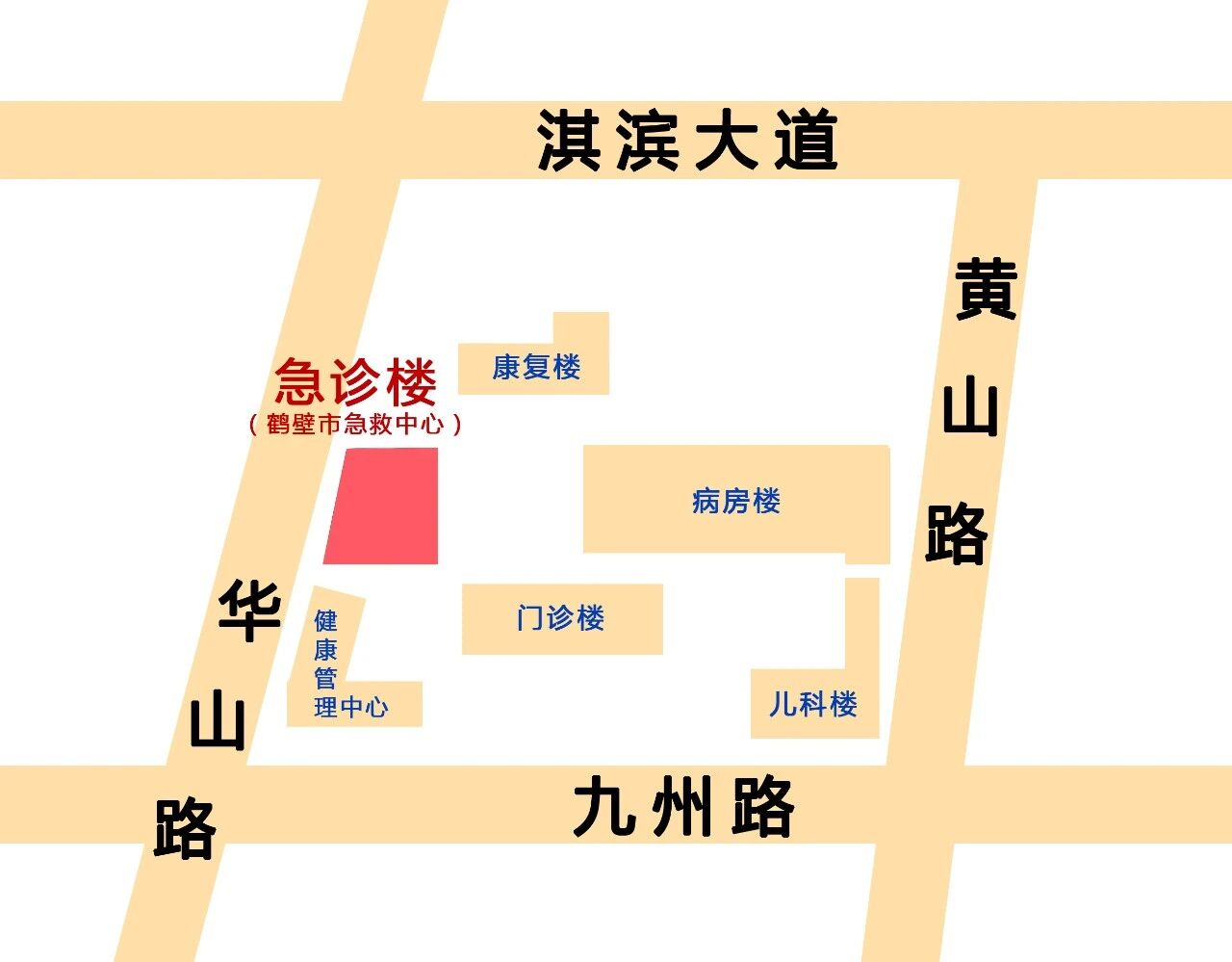? 華山路與九州路交叉口向北100米路東(新急診樓)。