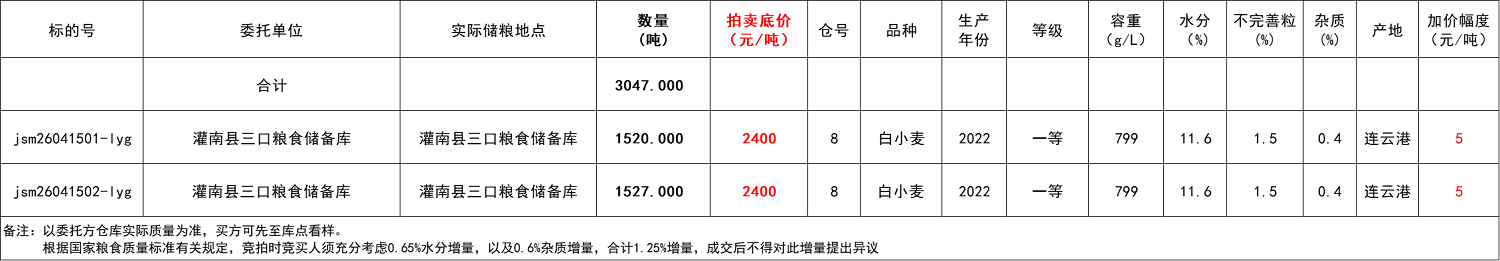 交款期、交割期同為自從合同成立之日起至2026年5月15日。交割數(shù)量以倉內(nèi)實際數(shù)量為準,如出現(xiàn)溢余,溢余部分買方必須按標的成交價同價提清,相應(yīng)貨款由買方直接支付到賣方指定賬戶。(根據(jù)國家糧食質(zhì)量標準有關(guān)規(guī)定,競拍時競買人須充分考慮0.65%水分增量,0.60%雜質(zhì)增量,合計1.25%增量,成交后不得對此增量提出異議,若數(shù)量出現(xiàn)剩余,則貨物最后一車出庫的競買人需按照競買價將剩余數(shù)量提貨完畢)