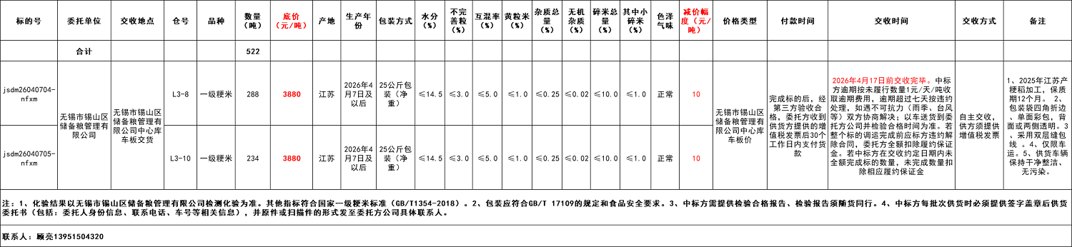 受******有限公司委托,江蘇糧油商品交易市場暨南方小麥分中心舉辦本次大米競價采購交易活動。具體事宜公告如下: